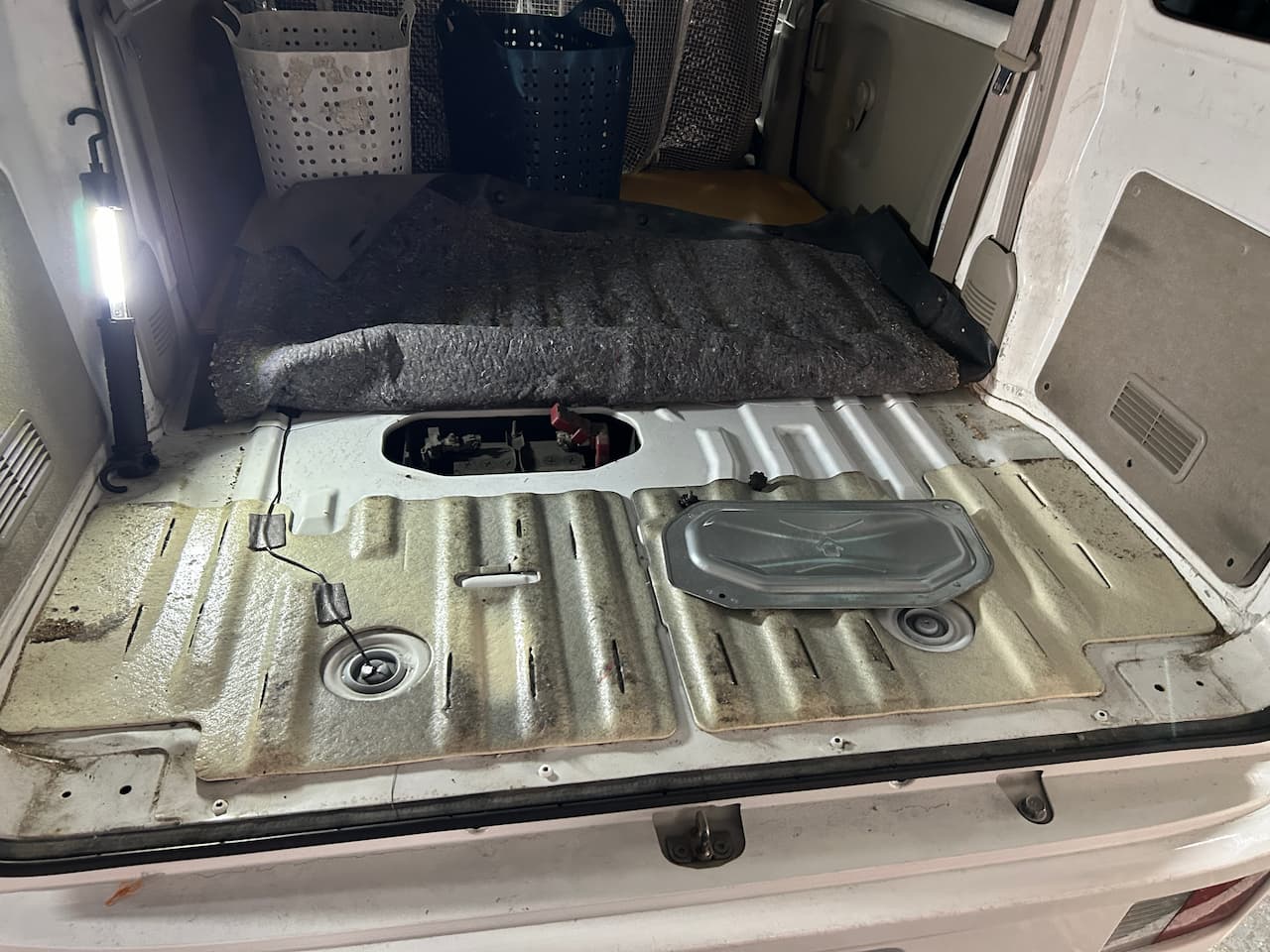荷室の下にバッテリーが収納されており、宅配業者さんのおクルマ特有のコンパネが引かれていますので、取り外す