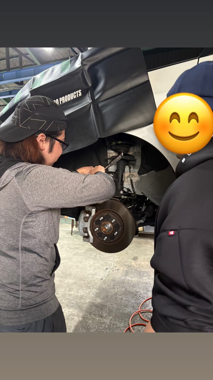 「自分で車をいじるのは初めて!」というユーザー様でしたが、ユーザー様と当塾生S君(先生?)が丁寧にサポートしながら、工具の使い方や足回りの構造を学びつつ、二人三脚で作業を進めました。