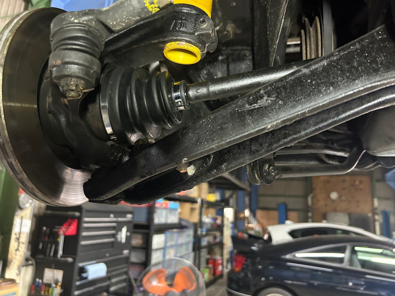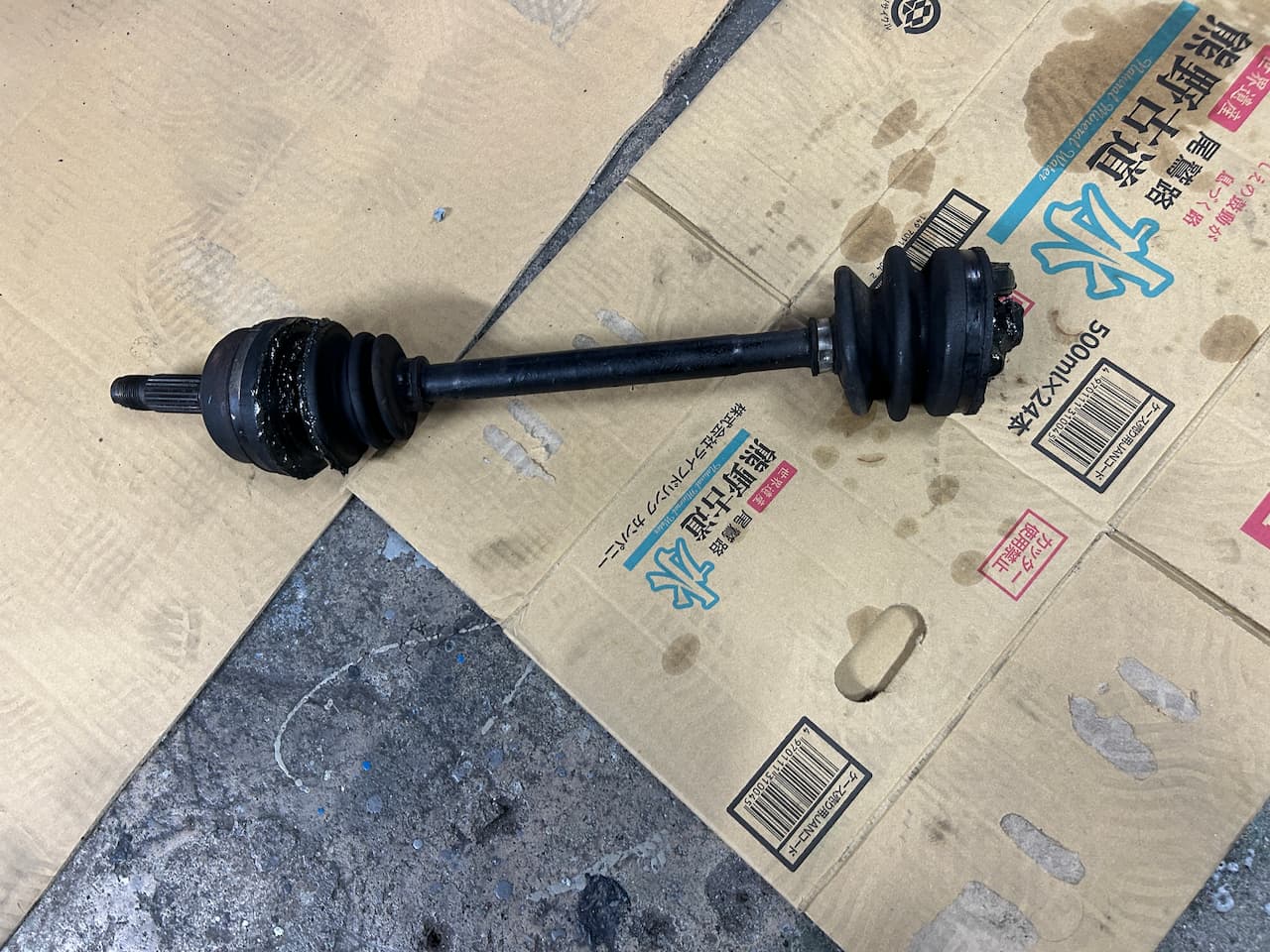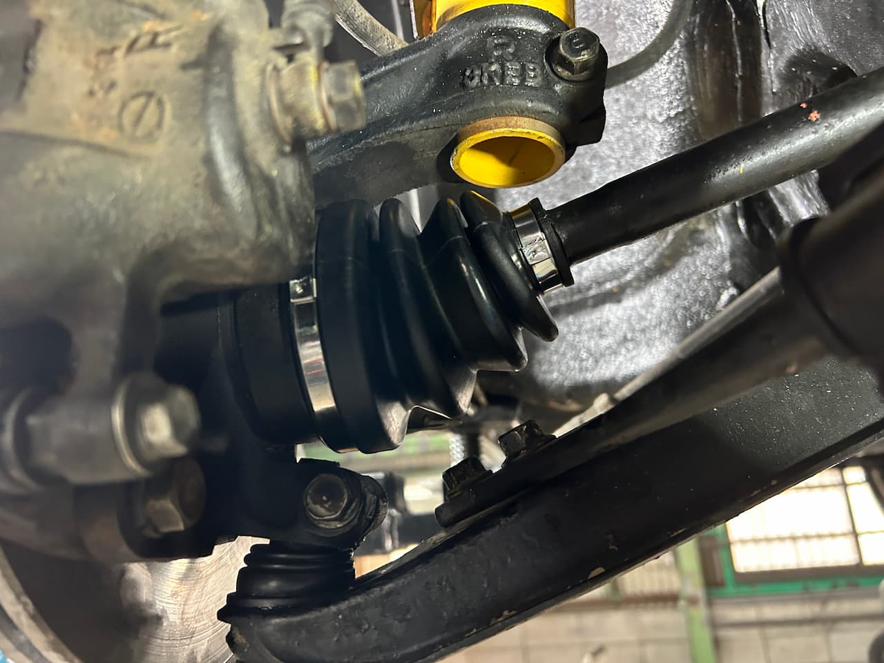 確認したところ、ブーツに亀裂が入っていたため、今回は左右のインナー・アウター計4箇所をすべて交換しました。 古いグリスを綺麗に洗浄し、新しい高性能グリスをたっぷり注入。 新品のブーツを装着したドライブシャフトは、見た目にも「守られている」安心感があります。
