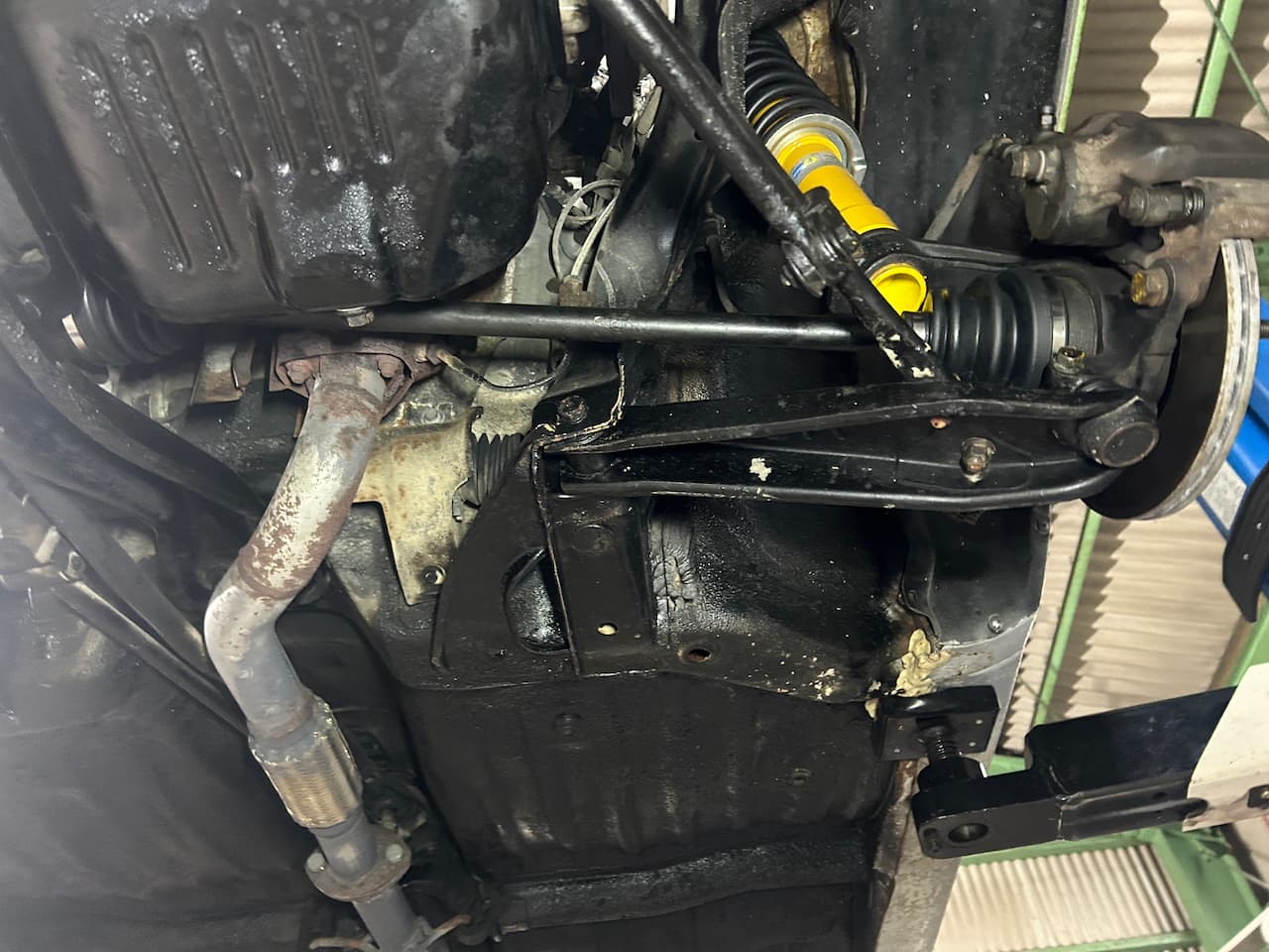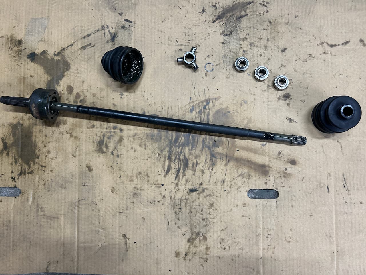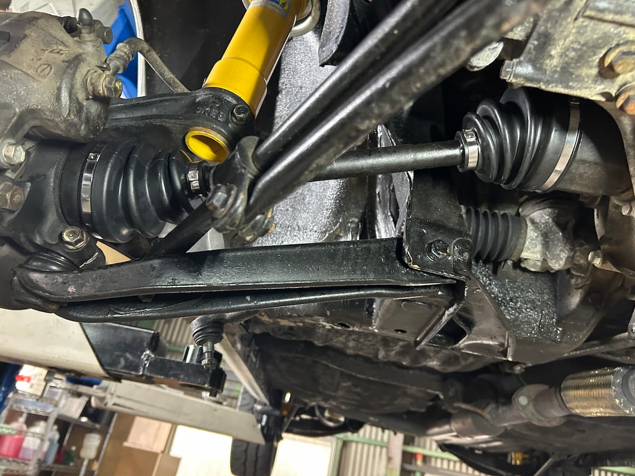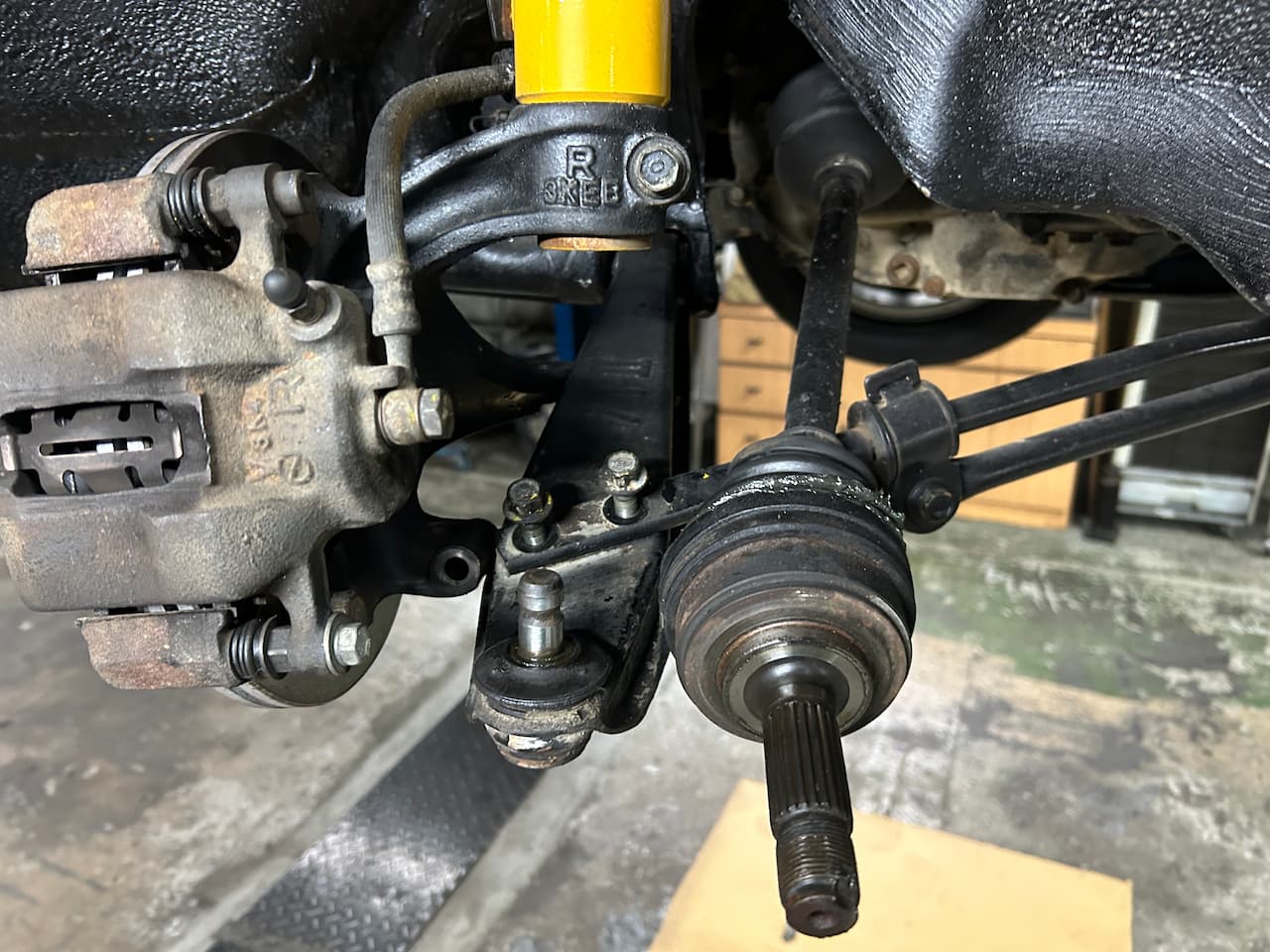 確認したところ、ブーツに亀裂が入っていたため、今回は左右のインナー・アウター計4箇所をすべて交換しました。 古いグリスを綺麗に洗浄し、新しい高性能グリスをたっぷり注入。 新品のブーツを装着したドライブシャフトは、見た目にも「守られている」安心感があります。