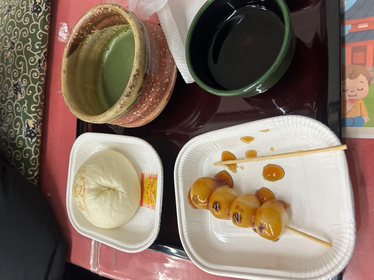 参拝後は、駐車場内にあるお茶屋さんで一休み。 温かいお茶と香ばしいみたらし団子をいただきました。凛とした空気の中で食べるお団子は格別の味わいです。